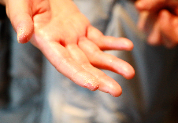 由于長期近距離接觸患者,徐平每天不得不頻繁洗手、高頻率使用醫(yī)用酒精進(jìn)行手部消毒。這樣做的結(jié)果,就是手部皮膚干燥粗糙、皸裂。但她沒有辦法讓自己停下來,只要疫情還沒有結(jié)束,她就不可能停下來。