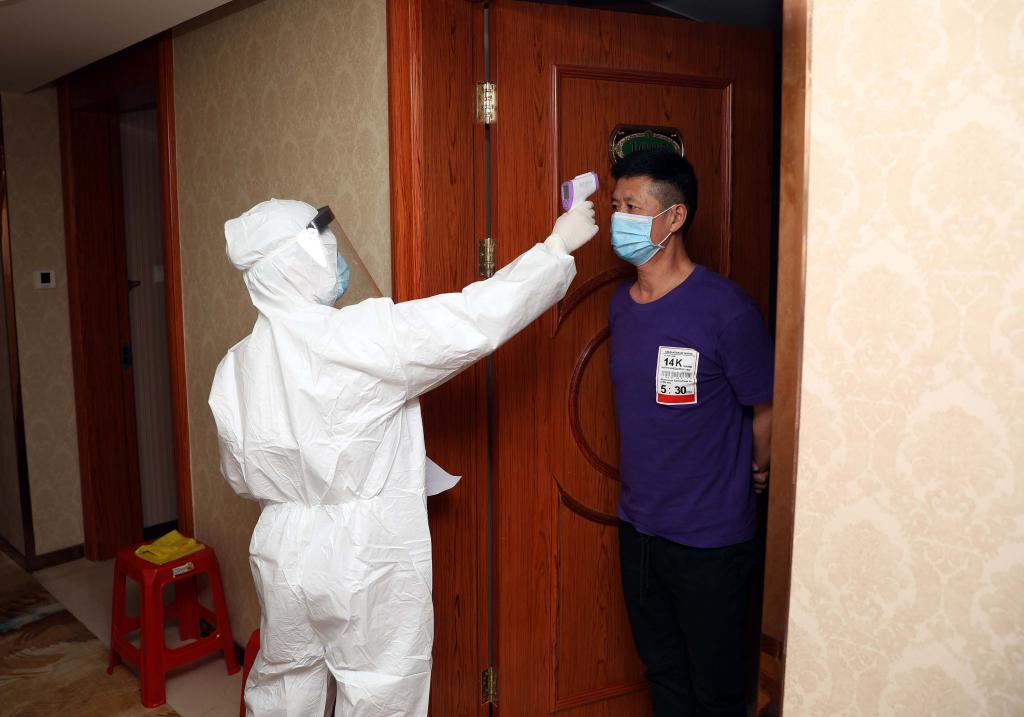 ▲醫(yī)護人員給南園街道健康驛站的臨時醫(yī)學(xué)觀察人員測量體溫。楊少昆攝