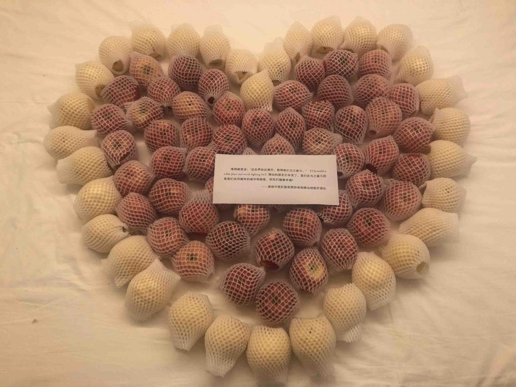 ▲深圳中醫(yī)肛腸醫(yī)院醫(yī)療團隊為健康驛站醫(yī)學(xué)觀察人員贈送的愛心水果。受訪者供圖