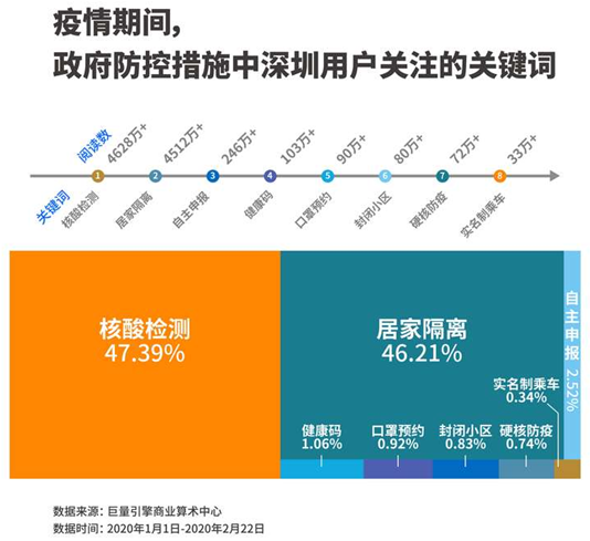 深圳市的具體防控舉措也被今日頭條深圳區(qū)域用戶高頻關(guān)注。數(shù)據(jù)顯示,免費的核酸檢測關(guān)注度排名第一,閱讀數(shù)達到4628萬次。為了防范病毒的社區(qū)傳播,2月12日起,深圳市對于居家隔離觀察人員全面展開了病毒免費合作檢測工作。隔離者的確定集合了街道的逐戶排查和住戶的自主申報,結(jié)合住戶的行程軌跡,最大程度避免遺漏。
