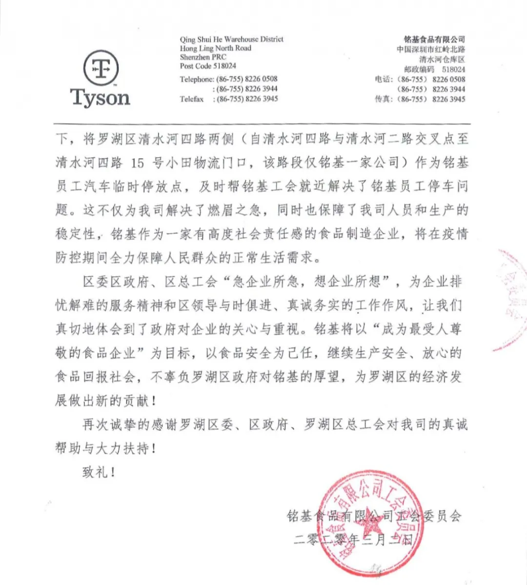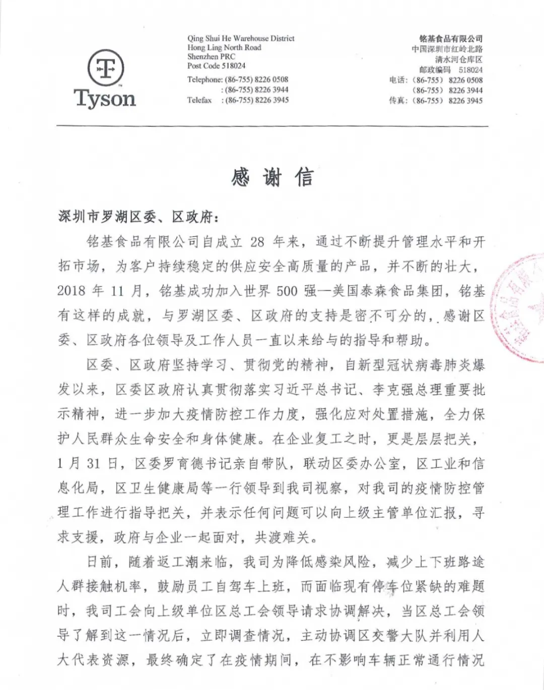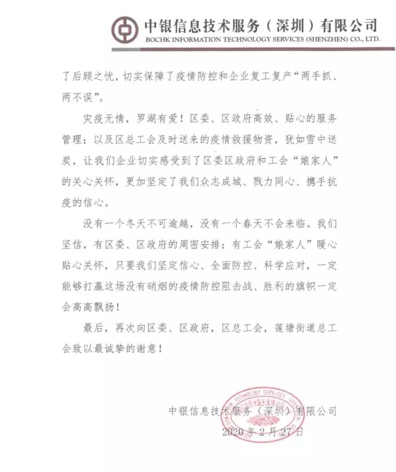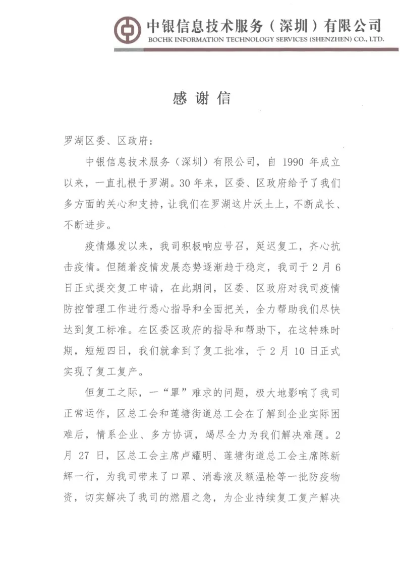 中銀信息技術(shù)服務(wù)(深圳)有限公司、銘基食品有限公司在復(fù)工復(fù)產(chǎn)后都遇到了一些困難,羅湖工會(huì)了解了他們的情況后,主動(dòng)發(fā)揮工會(huì)作用,幫企業(yè)解決困難,協(xié)助他們順利復(fù)工復(fù)產(chǎn)。近日,兩封感謝信送到了羅湖區(qū)委、區(qū)政府,向羅湖羅湖區(qū)委、區(qū)政府以及羅湖各級工會(huì)為企業(yè)的付出表示感謝。
