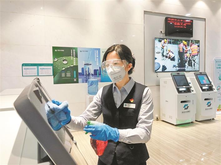 深圳水務(wù)集團(tuán)福田分公司福田營(yíng)業(yè)廳的楊麗娜,正對(duì)自動(dòng)服務(wù)機(jī)進(jìn)行消毒。