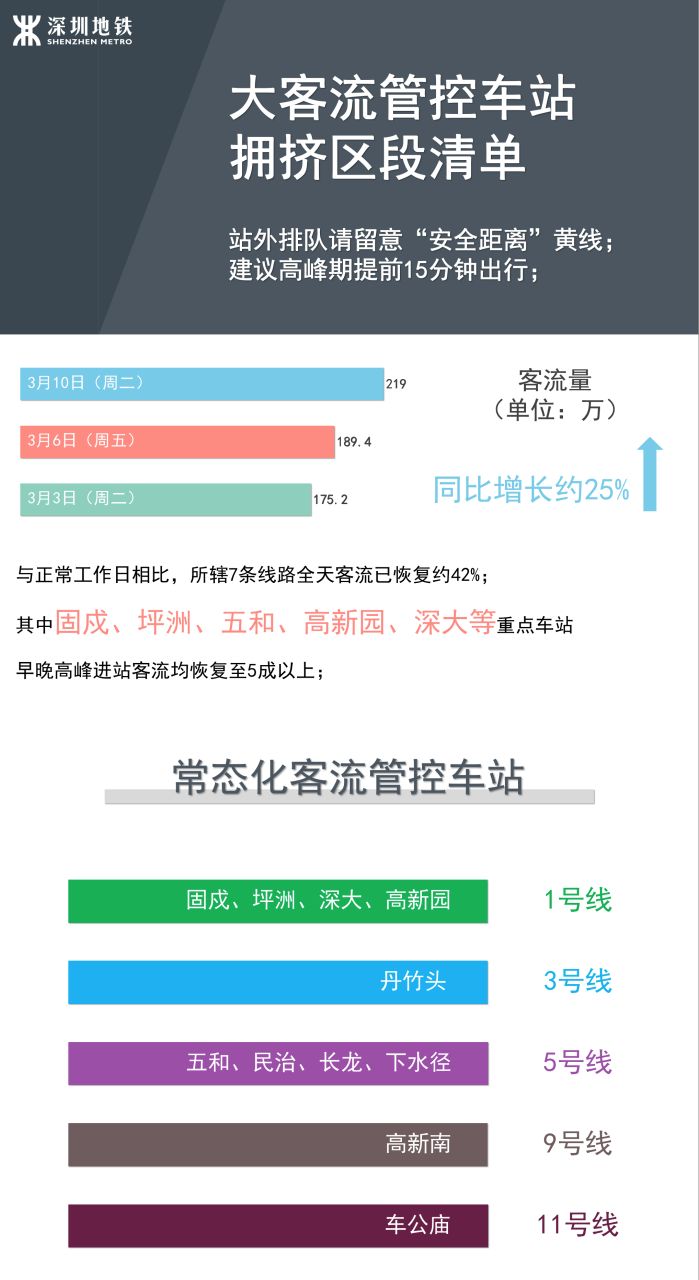 3月10日(周二),深圳地鐵所轄7條線路客流量已達(dá)219萬人次,為防止客流激增而造成乘客過度擁擠,深圳地鐵已在11座大客流站點(diǎn),實(shí)行常態(tài)化客流管控。另外有17座重點(diǎn)車站,也將視客流情況隨時(shí)采取客流管控措施。