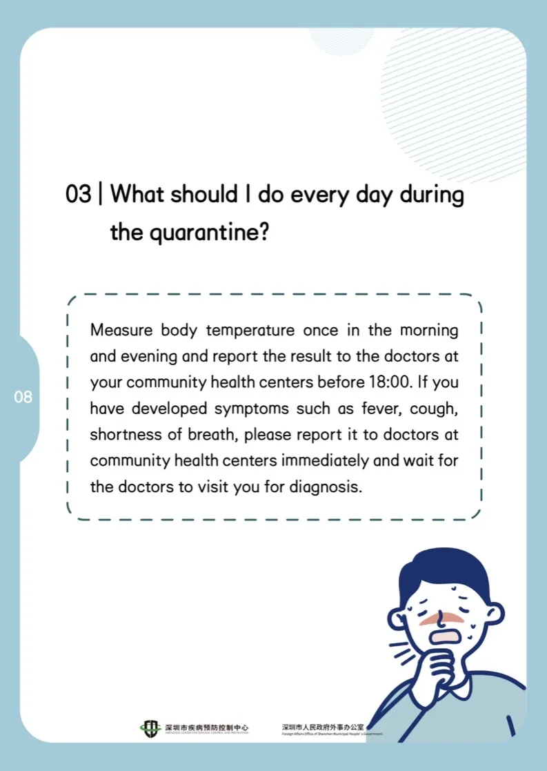 應(yīng)在早、晚各測量一次體溫,并于每天18∶00時(shí)前報(bào)告給社康醫(yī)生。如果出現(xiàn)有發(fā)熱、咳嗽、氣促等癥狀,應(yīng)立即向社康醫(yī)生報(bào)告,社康醫(yī)生會(huì)上門診斷。