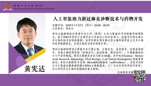 黃憲達教授現(xiàn)擔任香港中文大學(深圳)生命與健康科學學院教學助理院長、瓦謝爾計算生物研究院執(zhí)行院長。他于2003年畢業(yè)于臺灣中央大學資訊工程學系博士,此前為臺灣交通大學生物科技學系講座教授。他曾任職臺灣交通大學生物科技學系主任及生物科技學院副院長、臺灣生物資訊學會理事長等。