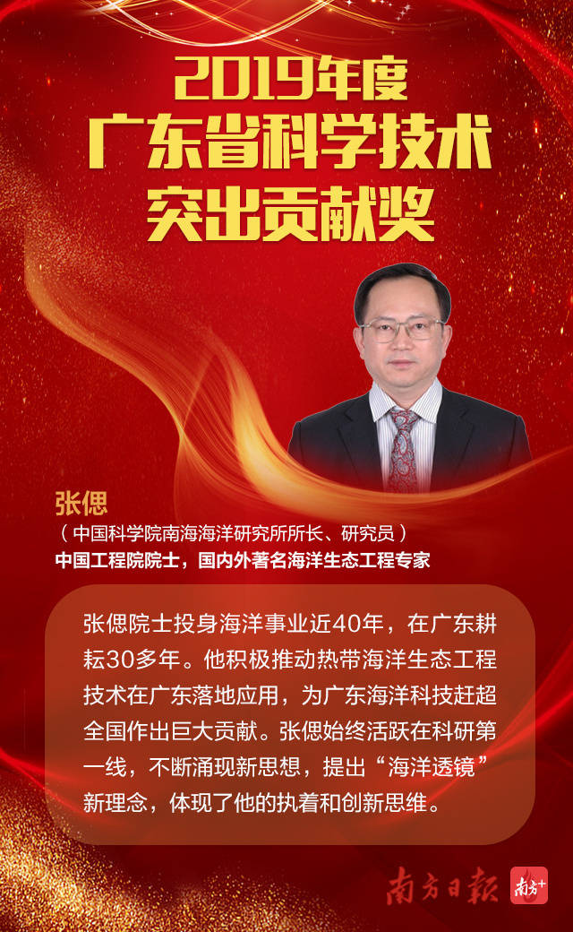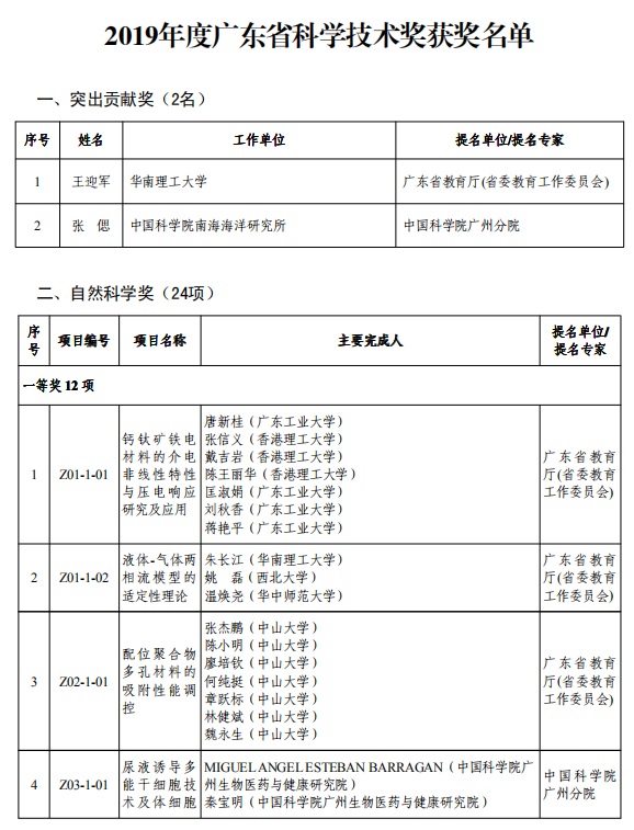 其中,2019年度廣東省科學(xué)技術(shù)突出貢獻(xiàn)獎(jiǎng)的獲獎(jiǎng)?wù)叻謩e為:中國(guó)工程院院士、亞太材料科學(xué)院院士、華南理工大學(xué)教授王迎軍;中國(guó)工程院院士,國(guó)內(nèi)外著名海洋生態(tài)工程專家,中科院南海海洋研究所所長(zhǎng)、研究員張偲。