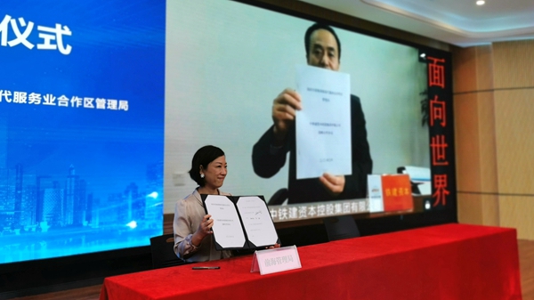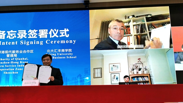與以往不同,本次簽約儀式采用了現(xiàn)場簽約與視頻連線“云簽約”結(jié)合的特殊方式。前海管理局與中鐵建資本控股集團有限公司,與國研科工、彩虹魚,與北京大學匯豐商學院、劍橋大學嘉治商學院的合作采用了“云簽約”。
