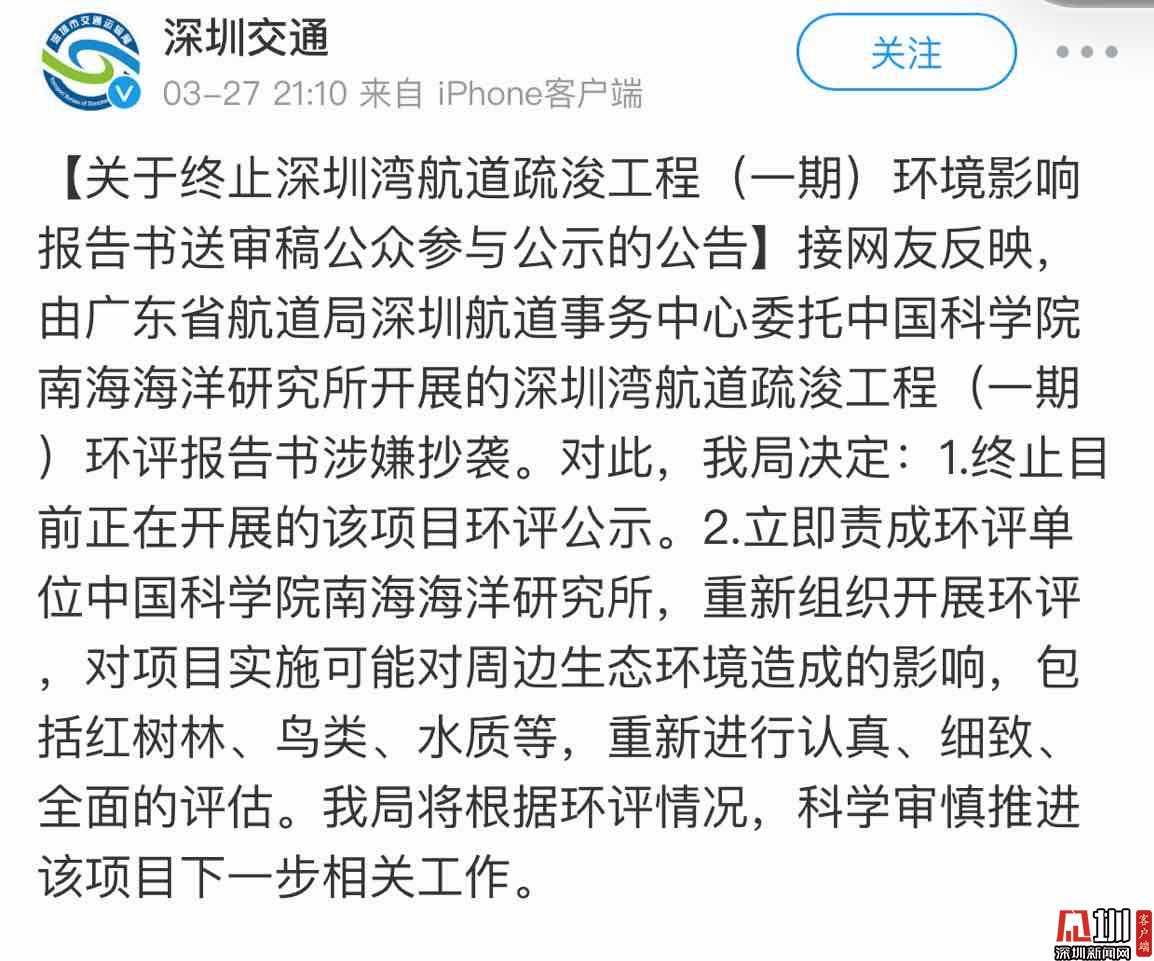 3月27日21時10分,深圳市交通運輸管理局官方微博發(fā)布消息稱:接網(wǎng)友反映,由廣東省航道局深圳航道事務(wù)中心委托中國科學(xué)院南海海洋研究所開展的深圳灣航道疏浚工程(一期)環(huán)評報告書涉嫌抄襲。對此,深圳市交通運輸管理局決定:1.終止目前正在開展的該項目環(huán)評公示。2.立即責(zé)成環(huán)評單位中國科學(xué)院南海海洋研究所,重新組織開展環(huán)評,對項目實施可能對周邊生態(tài)環(huán)境造成的影響,包括紅樹林、鳥類、水質(zhì)等,重新進行認真、細致、全面的評估。深圳市交通運輸管理局將根據(jù)環(huán)評情況,科學(xué)審慎推進該項目下一步相關(guān)工作。