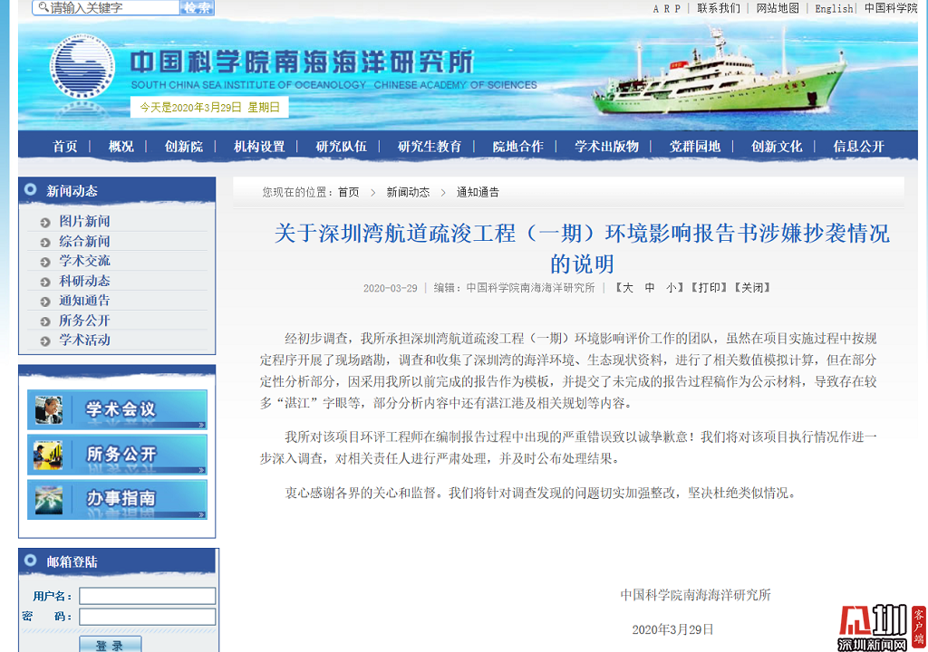 見圳客戶端·深圳新聞網(wǎng)2020年3月29日(見圳客戶端、深圳新聞網(wǎng)記者 鐘鴻冰)3月29日,中國科學(xué)院南海海洋研究所在官網(wǎng)發(fā)布說明稱:深圳灣航道疏浚工程(一期)環(huán)境影響評價(jià)工作雖按規(guī)定進(jìn)行了現(xiàn)場踏勘,調(diào)查并收集了有關(guān)資料等環(huán)節(jié),但因采用其以前的報(bào)告作為模板,并將未完成的報(bào)告作為公示材料,導(dǎo)致公示的環(huán)評報(bào)告中出現(xiàn)多處錯(cuò)誤。南海海洋研究所表示,將對相關(guān)責(zé)任人嚴(yán)肅處理并公示處理結(jié)果。
