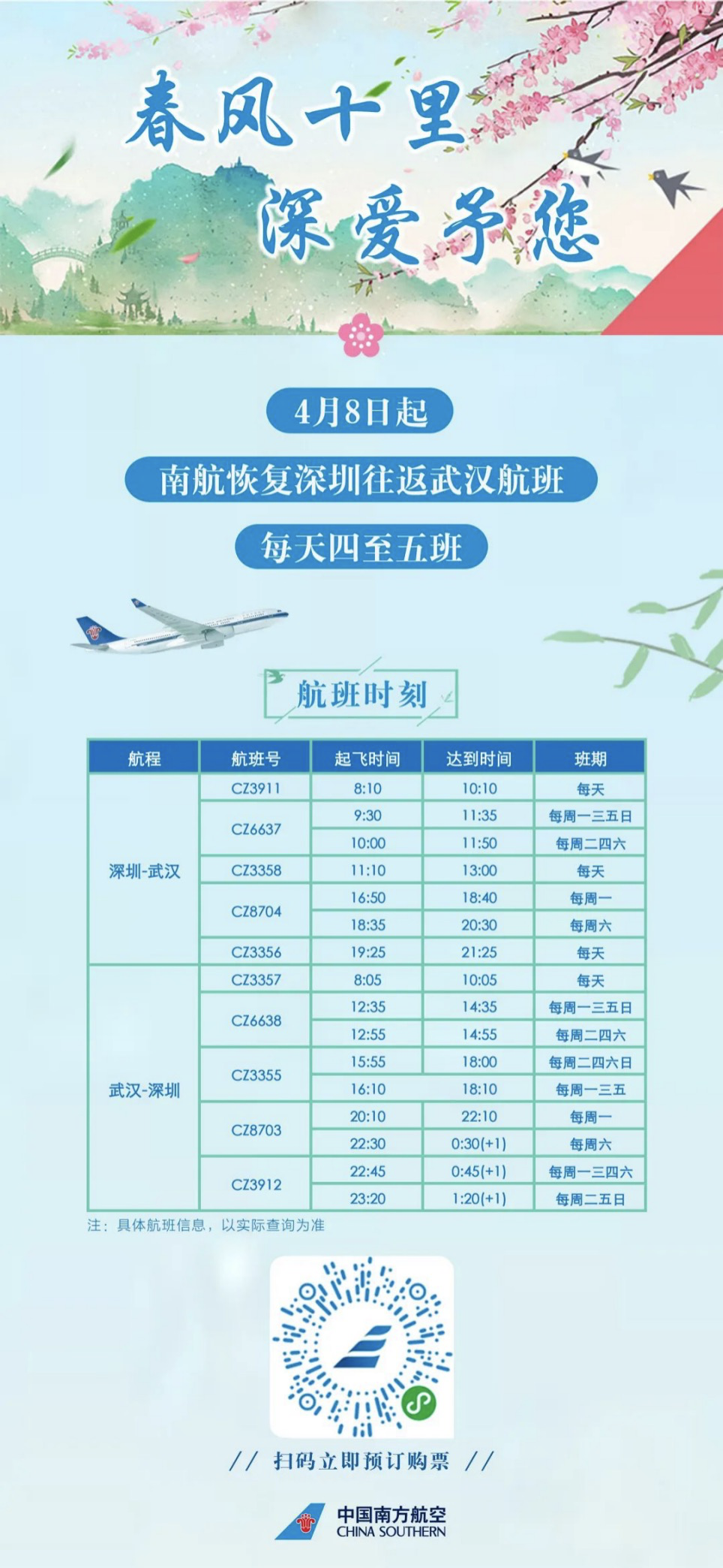 原標(biāo)題:4月8日起南航恢復(fù)深圳往返武漢航班