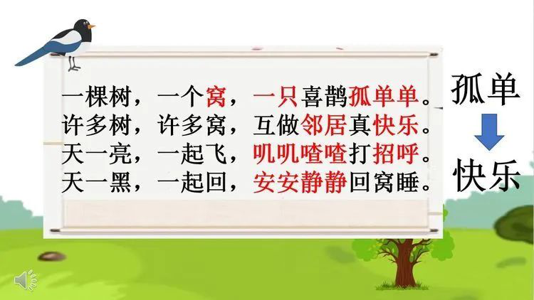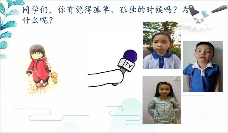 在劉老師的課堂上,她帶來《樹和喜鵲》故事中主人公小喜鵲日記本獎(jiǎng)勵(lì)讀書流利、情感充沛的孩子們。通過小喜鵲的日記,婉儀老師將課堂成功地轉(zhuǎn)接到課文的文本當(dāng)中。進(jìn)而有對文章中出現(xiàn)的事物、事物所具備的特點(diǎn)展開了細(xì)致而有趣的學(xué)習(xí)。期間,婉儀老師還化身小記者,用三段對于自己學(xué)生的采訪視頻,讓學(xué)生對于“孤單”二字有了更加深刻的理解。