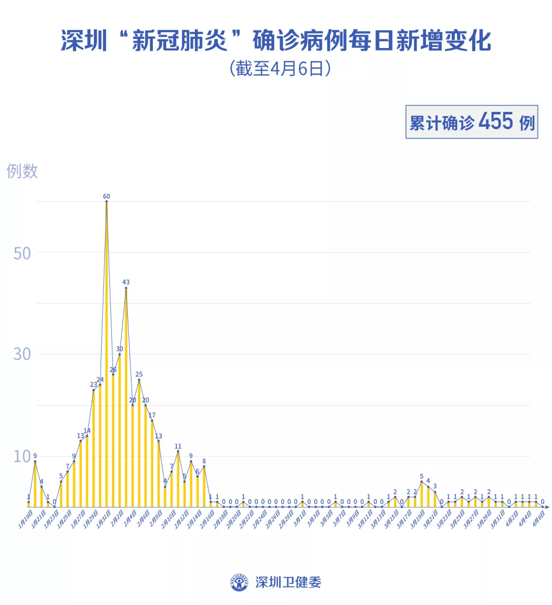截至4月6日24時(shí),深圳累計(jì)報(bào)告新冠肺炎病例455例。4月6日當(dāng)天新增無癥狀感染者1例。