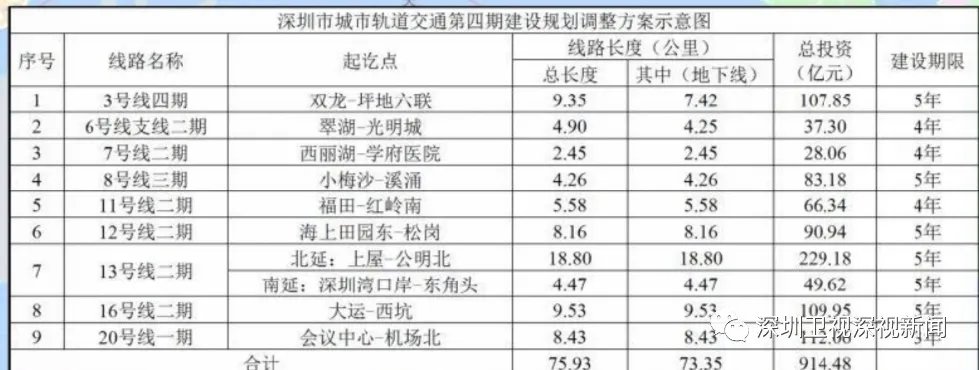 13號(hào)線二期,含北延段和南延段。北延段自上屋站至公明北站,線路長度18.8公里,為地下線,采用A型車8輛編組;總投資229.18億元,項(xiàng)目建設(shè)工期5年。南延段自深圳灣口岸站至東角頭站。線路長度4.47公里,為地下線,總投資49.62億元,建設(shè)工期5年。