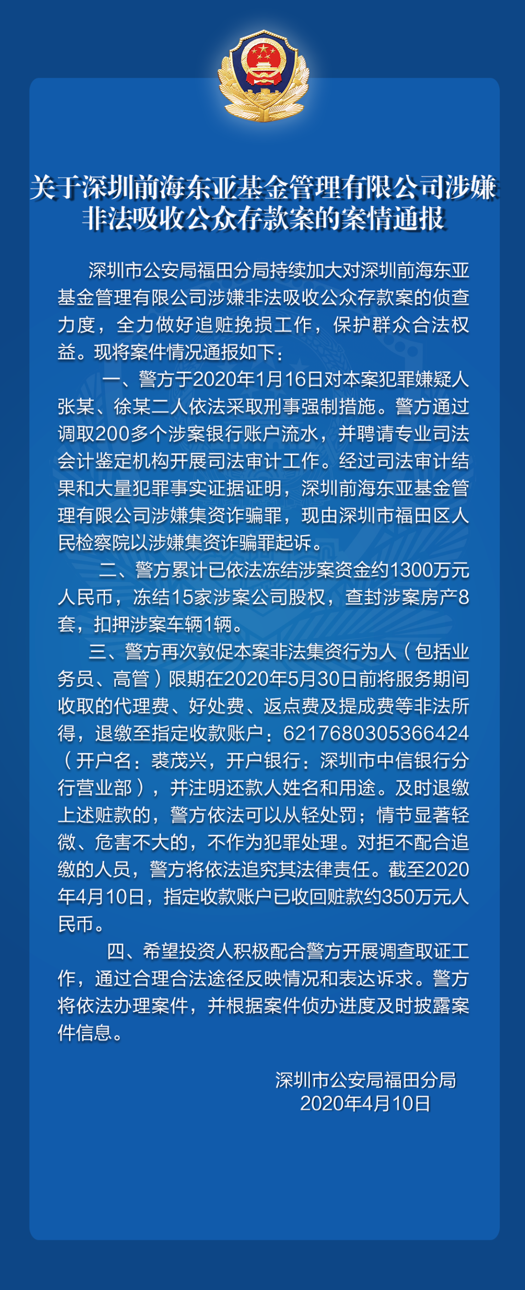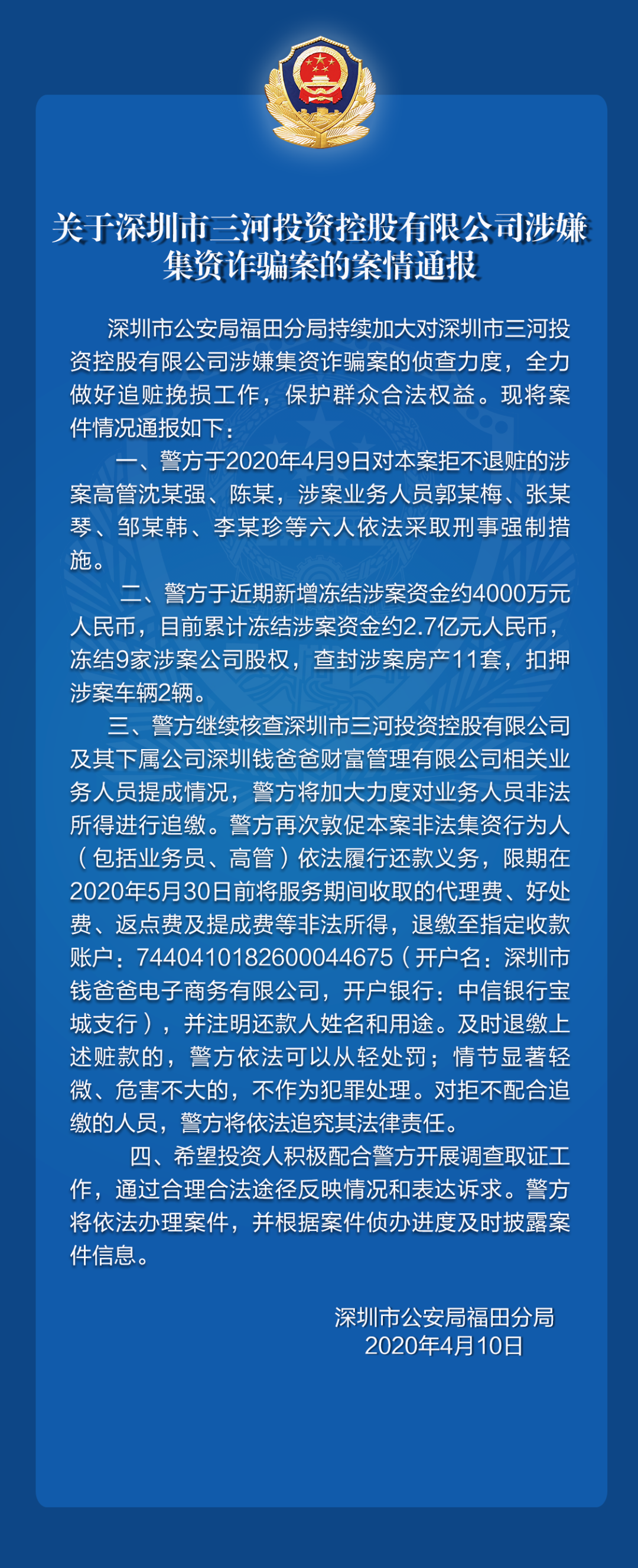 關(guān)于深圳前海東亞基金管理有限公司涉嫌非法吸收公眾存款、深圳市三河投資控股有限公司涉嫌集資詐騙的案件情況通報(bào)