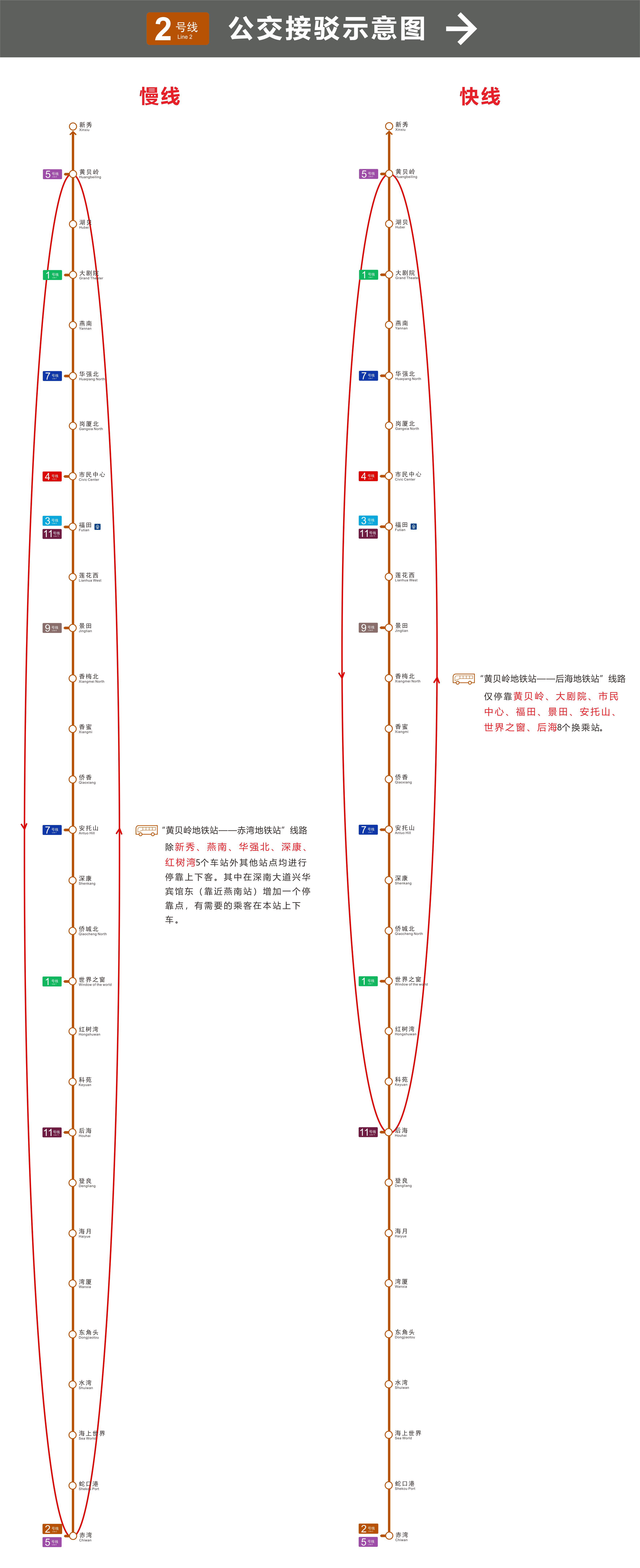 為了方便期間市民乘客的出行,屆時將組織循環(huán)開行2號線的兩條公交接駁線路。1、公交接駁慢線:“黃貝嶺站—赤灣站”。除新秀、燕南、華強北、深康、紅樹灣5個站點不停靠之外,其余各站均??可舷驴?。2、公交接駁快線:“黃貝嶺站—后海站”。僅??奎S貝嶺、大劇院、市民中心、福田、景田、安托山、世界之窗、后海共8個換乘站。