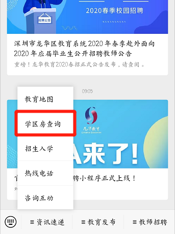 學區(qū)房鎖定情況可通過“龍華教育”微信公眾號—“資訊速遞”—“學區(qū)房查詢”自助查詢。查詢操作如下:
