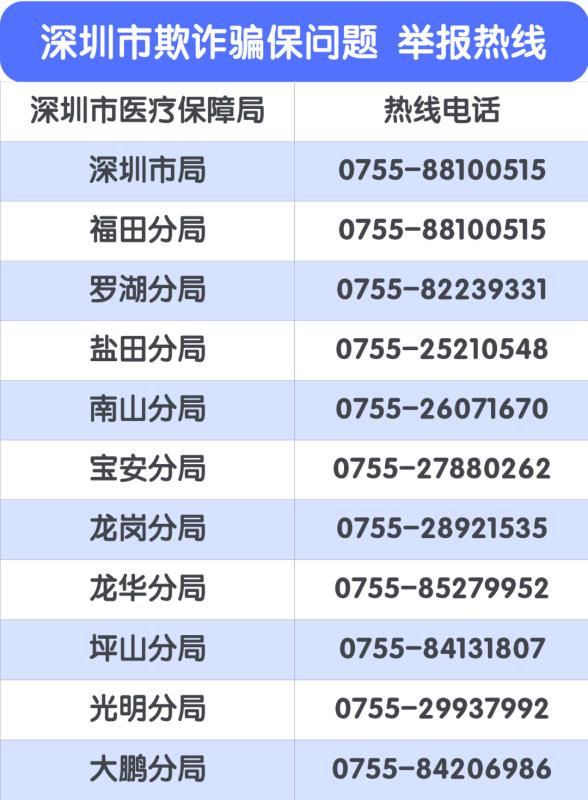 市醫(yī)保局已在深圳市各區(qū)設(shè)立投訴舉報(bào)電話,歡迎廣大市民共同參與醫(yī)保基金監(jiān)督管理。市民可通過(guò)實(shí)名舉報(bào)和匿名舉報(bào)方式檢舉、揭發(fā)欺詐騙保行為,經(jīng)查證屬實(shí)的,將根據(jù)《深圳市欺詐騙取醫(yī)療保障基金行為舉報(bào)獎(jiǎng)勵(lì)實(shí)施細(xì)則(試行)》對(duì)舉報(bào)人予以獎(jiǎng)勵(lì),獎(jiǎng)金最高可達(dá)10萬(wàn)元!(記者 莊瑞玉)