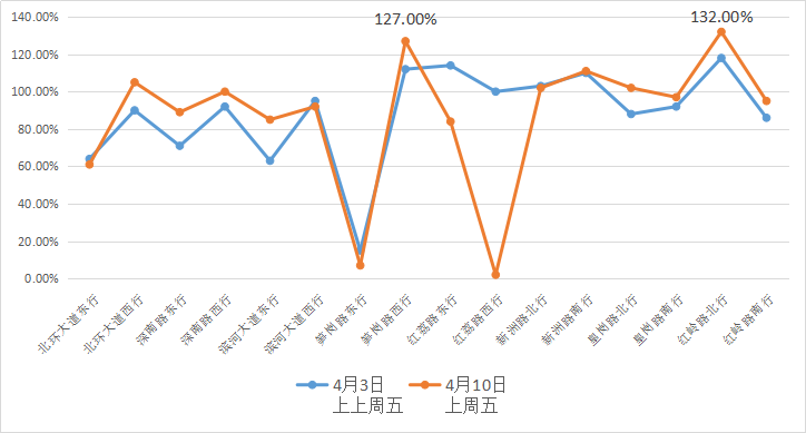 同時,主干道的飽和程度也處于高位。經(jīng)對上周五和上上周五晚高峰各主干道飽和度情況分析,筍崗路西行和紅嶺路北行飽和度最高,超過120%。預計本周五各主干道飽和度,依然維持較高狀態(tài)。