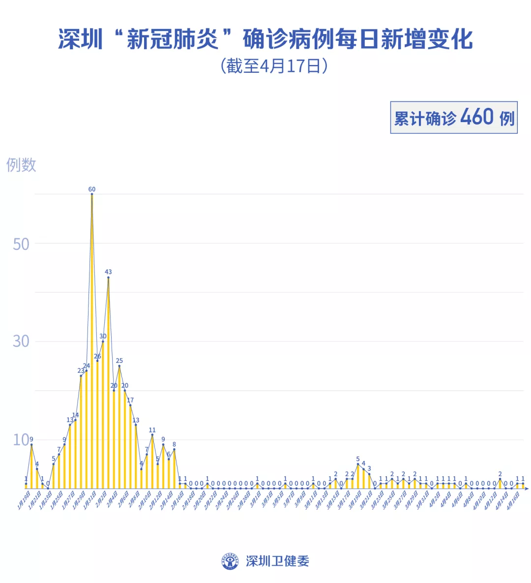 截至4月17日24時,深圳累計報告新冠肺炎病例460例。4月17日當(dāng)天新增境內(nèi)病例1例。