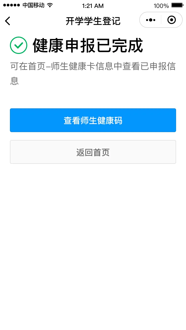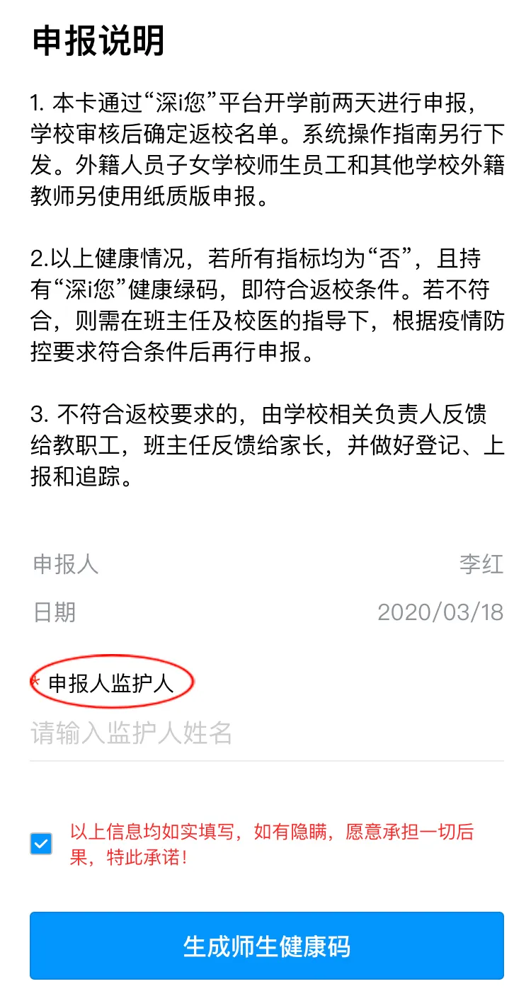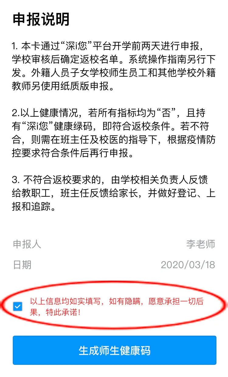 健康信息申報(bào)后,請(qǐng)勾選申報(bào)承諾,點(diǎn)擊“生成師生健康碼”即可完成健康申報(bào)。