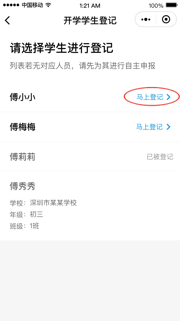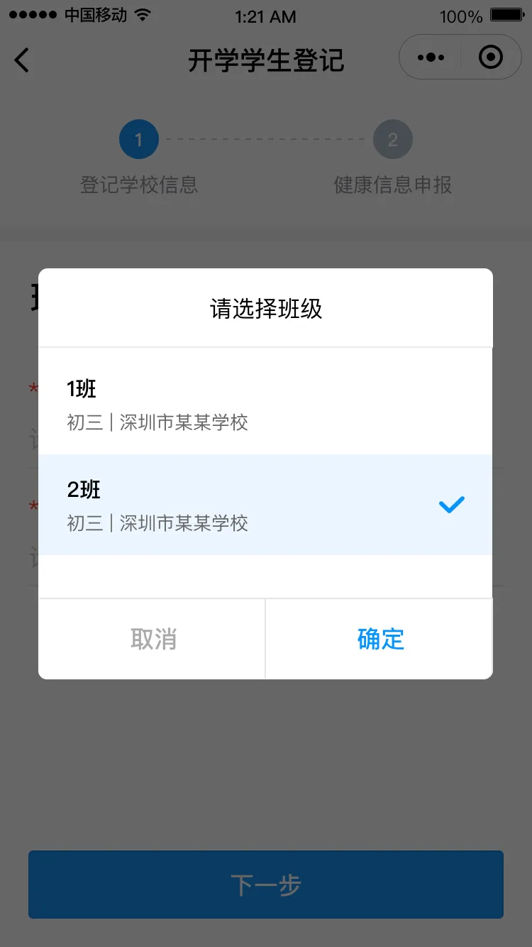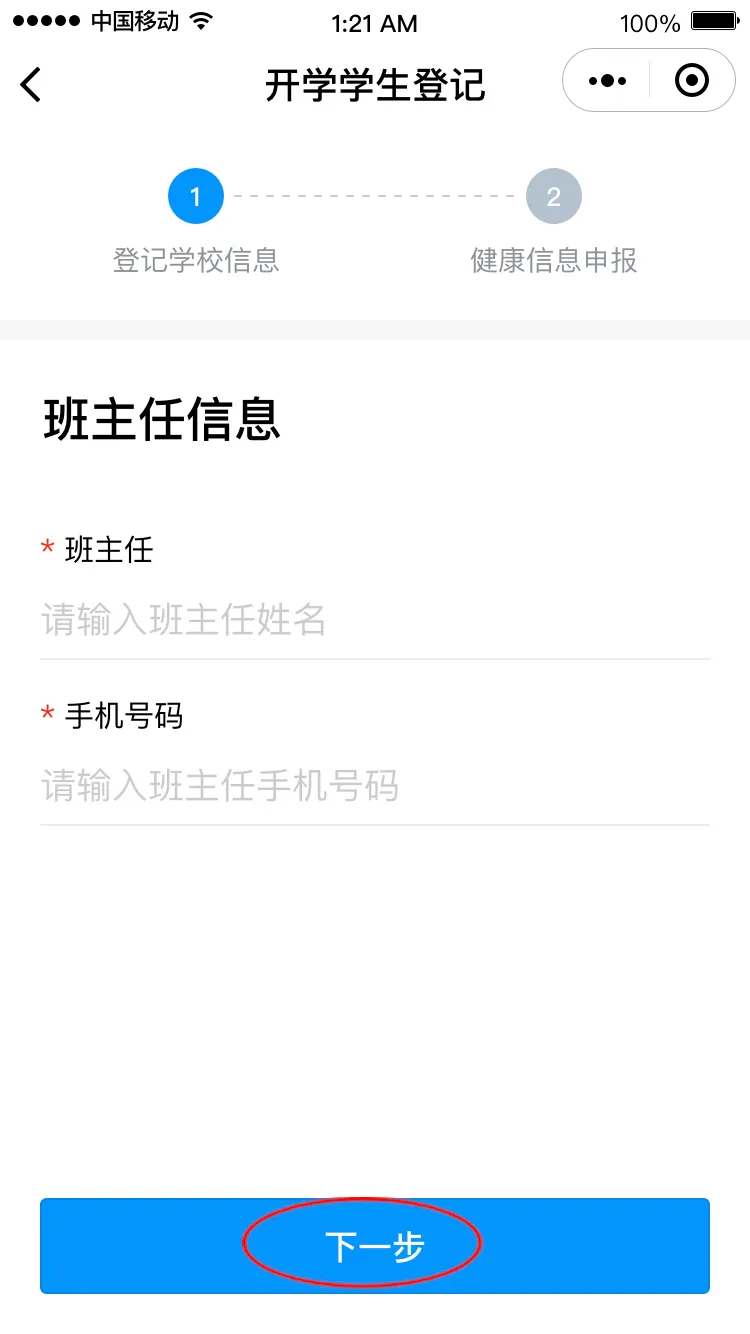 進(jìn)入“開學(xué)學(xué)生登記”頁(yè)面,點(diǎn)擊“馬上登記”進(jìn)入登記界面,填寫班主任姓名和手機(jī)號(hào)碼后點(diǎn)擊“下一步”,請(qǐng)選擇對(duì)應(yīng)的班級(jí),進(jìn)入健康申報(bào)卡界面。