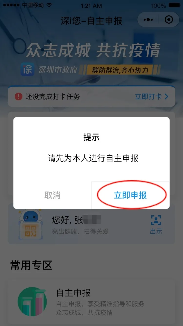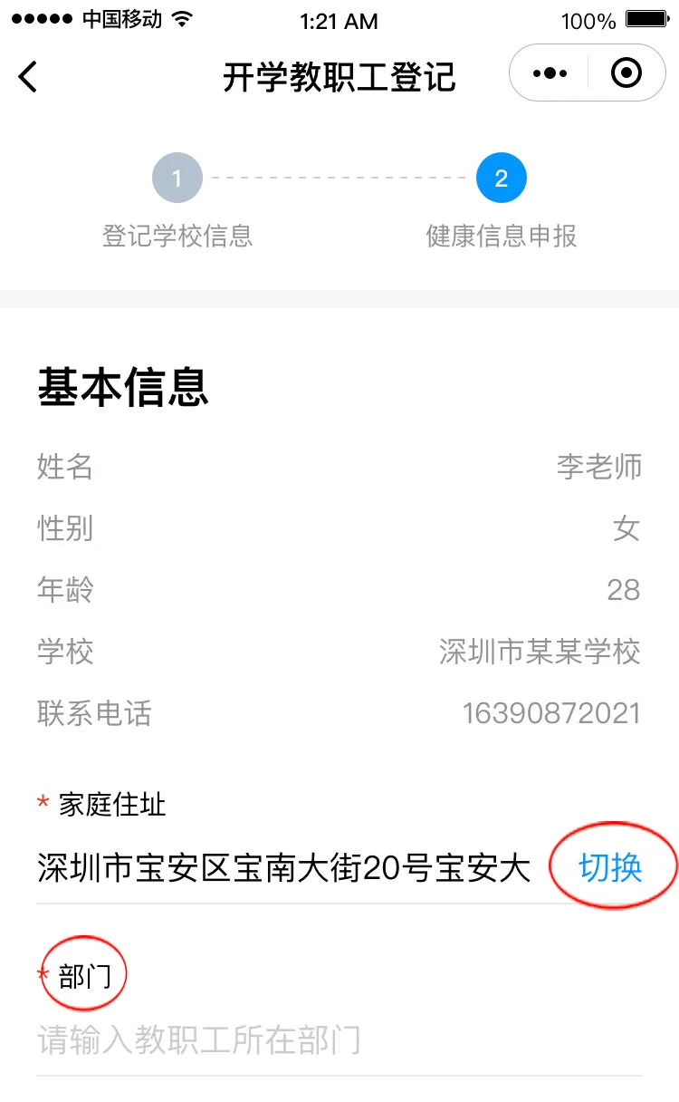請(qǐng)根據(jù)實(shí)際情況完成健康信息申報(bào),包括選擇家庭住址、填寫所在部門、申報(bào)健康情況。