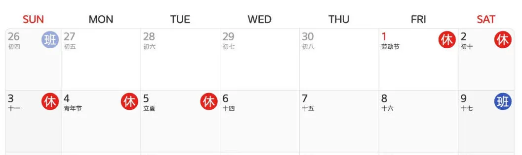 “五一”小長(zhǎng)假即將到來,4月26日(本周日)5月9日(下下周六)要上班!
