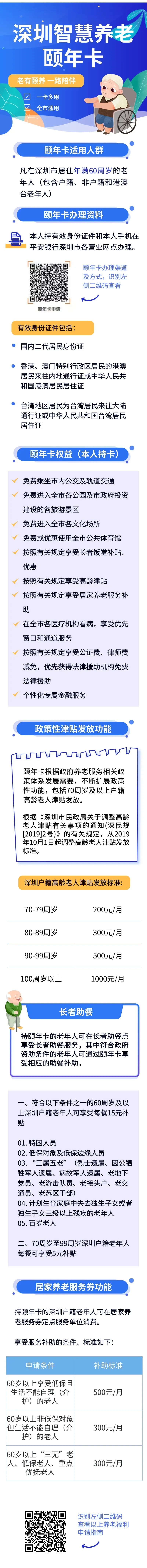 據(jù)悉,凡在深圳市居住年滿60周歲以上的老年人(包含港澳臺(tái)老年人),均可持有效身份證件和手機(jī)申請(qǐng)辦理?!邦U年卡”持卡人,可享受敬老優(yōu)待,包括免費(fèi)進(jìn)入全市各公園,免費(fèi)進(jìn)入市政府投資建設(shè)各旅游景區(qū),免費(fèi)乘坐市內(nèi)公交車和軌道交通。70周歲及以上戶籍老人還可享受高齡津貼發(fā)放;符合規(guī)定的戶籍老年人可享受居家養(yǎng)老消費(fèi)的優(yōu)惠和補(bǔ)貼,包括:生活照料、家政服務(wù)、康復(fù)護(hù)理服務(wù)、日托服務(wù)、心理咨詢等。