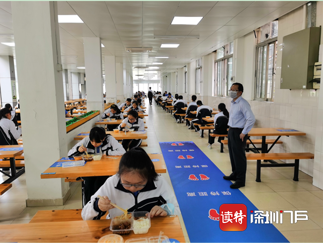 午餐期間,翠園初級(jí)中學(xué)在食堂的每張桌上貼有學(xué)生班級(jí)和姓名,一桌一人。就餐期間,學(xué)生有序就座。