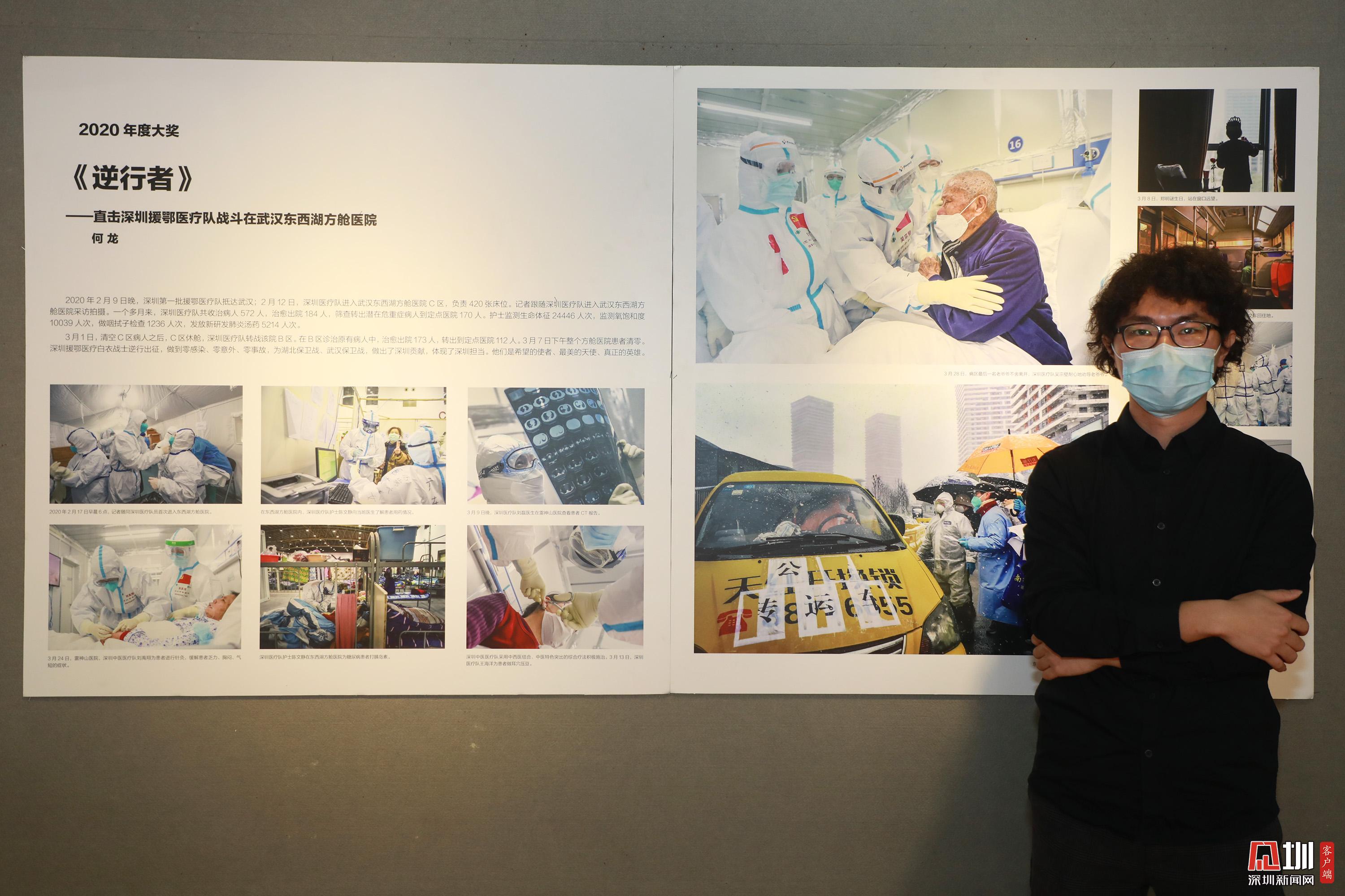 何龍告訴記者,從2020年2月9日晚跟隨著深圳第一批援鄂醫(yī)療隊抵達武漢,到3月31日和最后一批醫(yī)護人員一起回到深圳,他全程和深圳援鄂的醫(yī)療隊一起親歷了這場抗疫。在獲得本次攝影大賽年度大獎的攝影作品《逆行者》中,既不乏醫(yī)護人員幫助彼此穿戴防護服具、結(jié)束一天工作后乘坐空曠的公交車回住所等抗疫工作的細枝末節(jié),也有深圳援鄂醫(yī)生們對患者們注射胰島素,使用耳穴壓豆、針灸等中醫(yī)療法進行救治的醫(yī)療現(xiàn)場紀實;此外,還有東西湖方艙醫(yī)院終于休艙當(dāng)天,恰好過生日的醫(yī)護人員頭戴著生日紙冠靜靜眺望此刻窗外的武漢時的細膩情景。