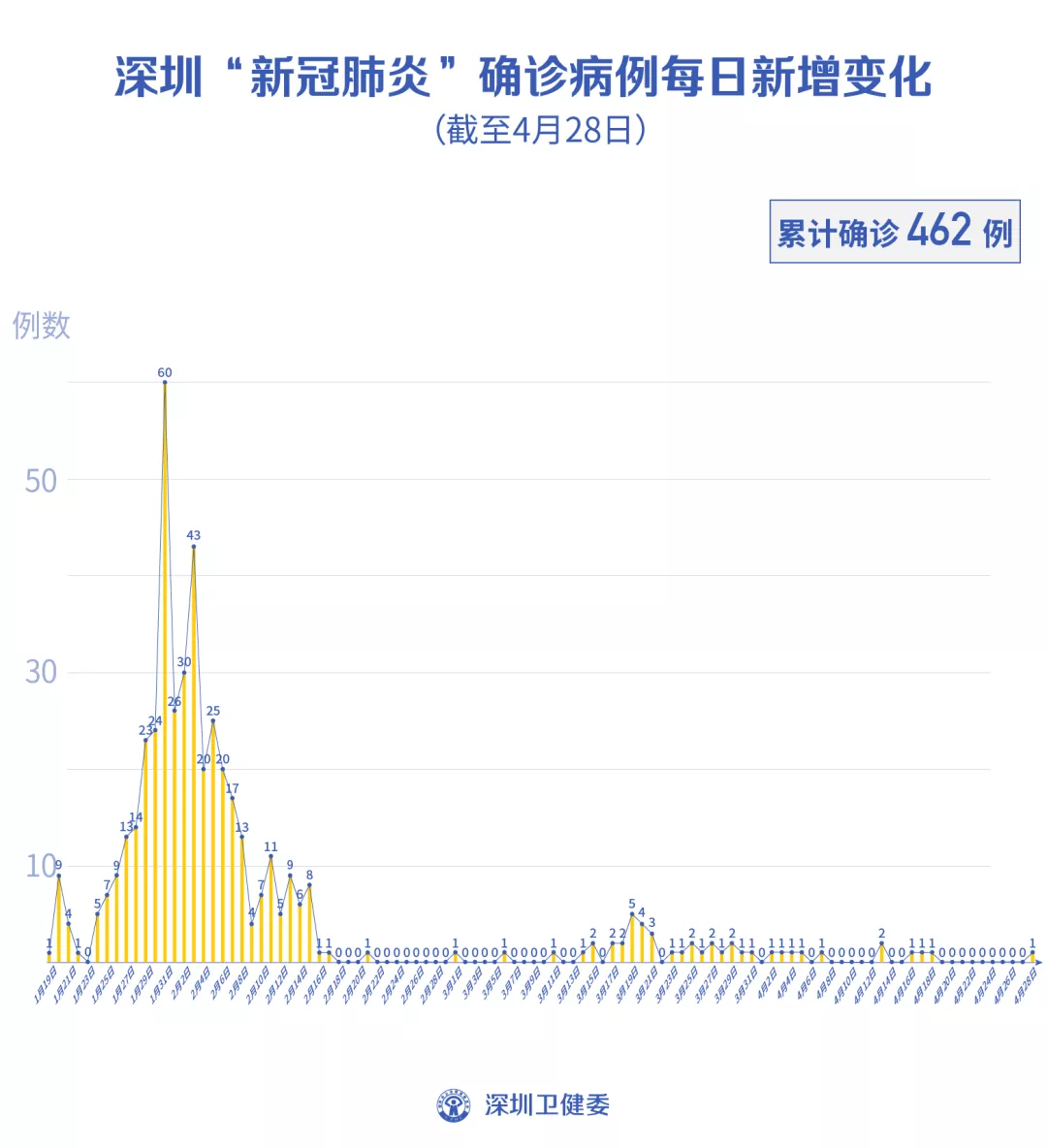截至4月28日24時,深圳累計報告新冠肺炎病例462例。4月28日當天新增境內(nèi)病例1例,出院4例。