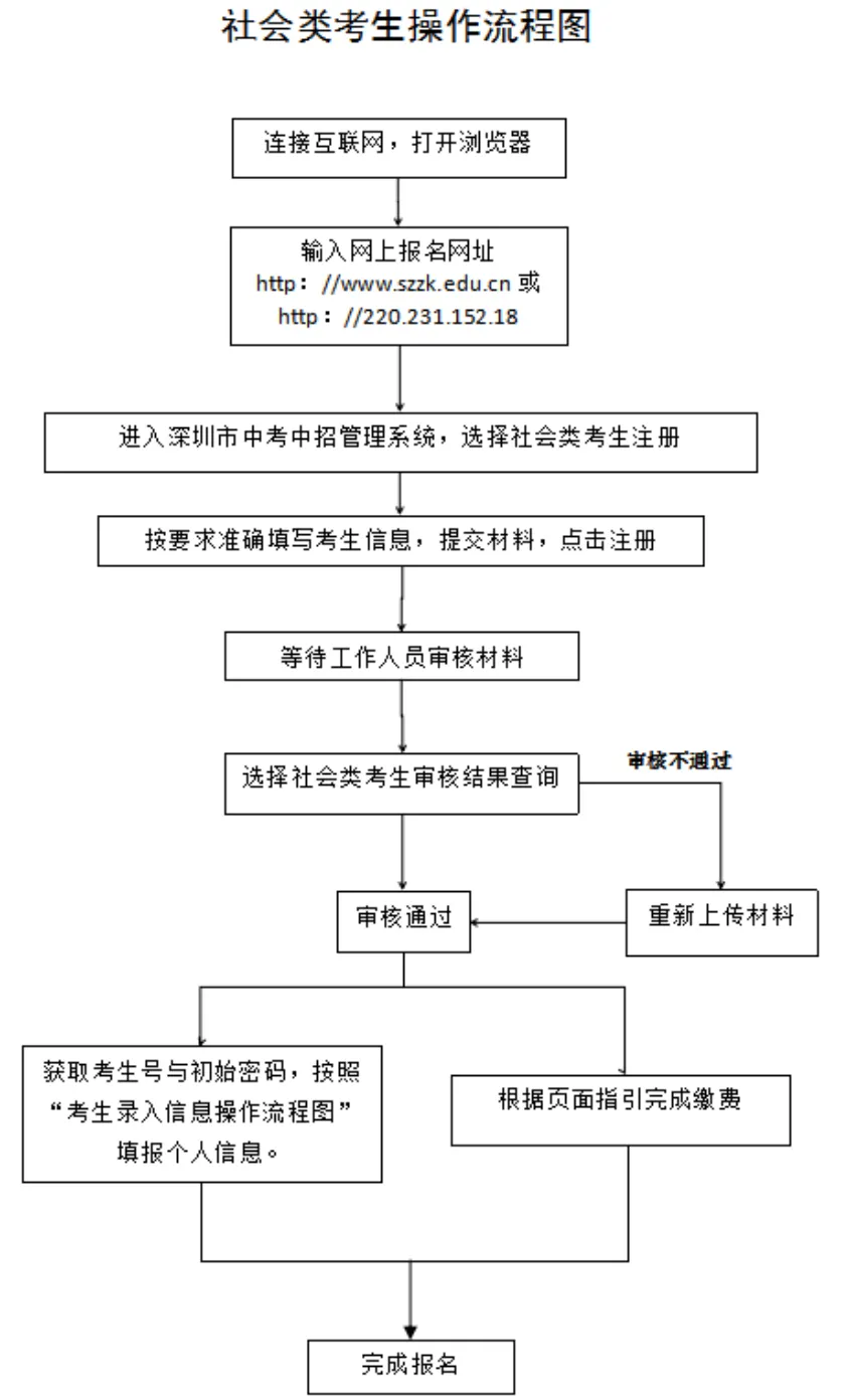 社會(huì)類考生采用網(wǎng)上報(bào)名方式進(jìn)行報(bào)名。報(bào)名考生需在5月6日至15日登錄報(bào)名網(wǎng)址(http://www.szzk.edu.cn/),按照提示進(jìn)行網(wǎng)上注冊(cè),上傳報(bào)名審核資料,由考生戶籍所在區(qū)社會(huì)報(bào)名點(diǎn)進(jìn)行線上審核,審核通過后系統(tǒng)將生成中考考生號(hào)及初始密碼,考生需用獲取的考號(hào)及密碼登錄中考中招管理系統(tǒng),填寫個(gè)人信息,具體操作可參考“考生錄入信息流程圖”。同時(shí)需在報(bào)名截止前根據(jù)指引完成網(wǎng)上繳費(fèi)。