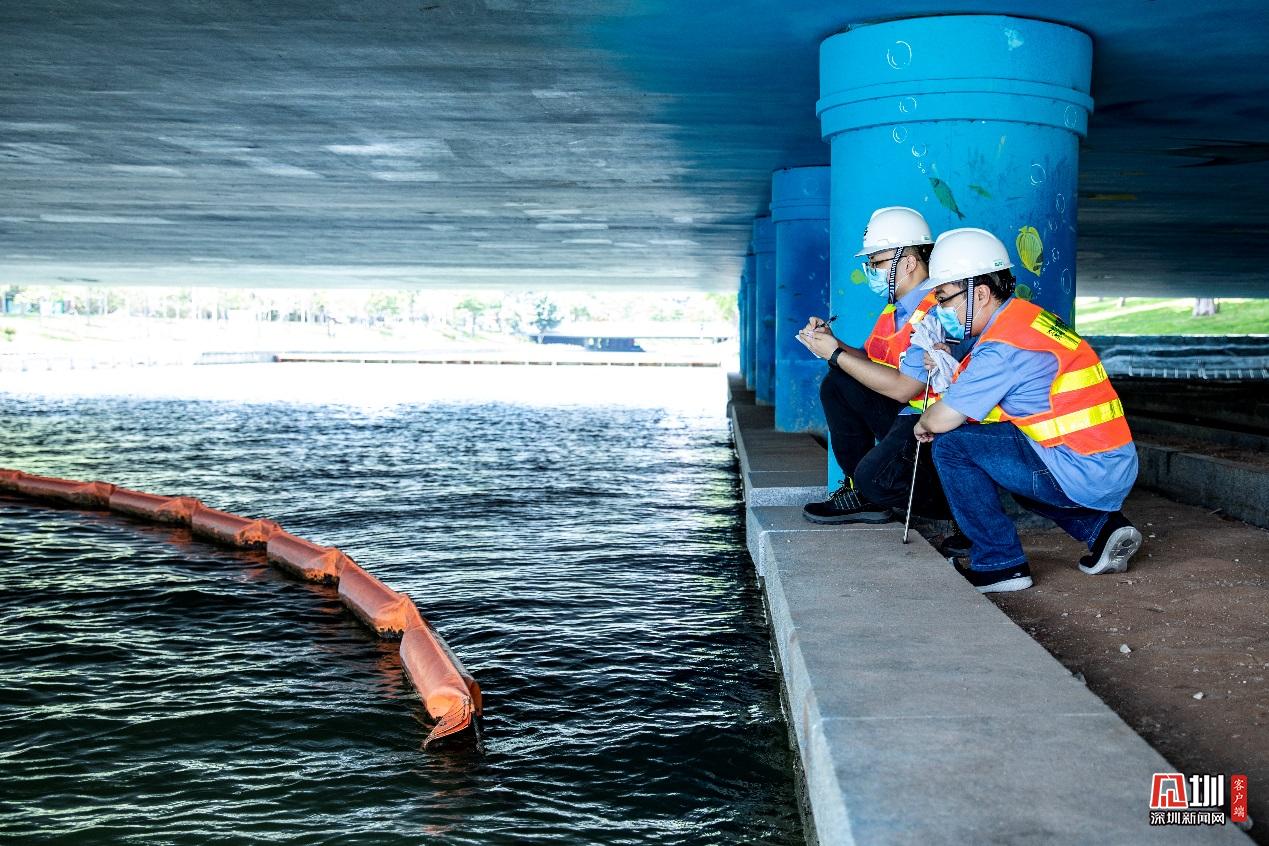 南山分公司工程師李香弟和黃港龍,正檢查中心河河口水質(zhì)情況。