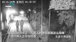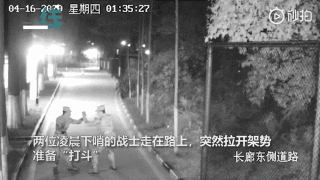 兩位凌晨下哨的戰(zhàn)士走在路上,突然間拉開(kāi)架勢(shì),準(zhǔn)備“打斗”。劍拔弩張之際,突然畫風(fēng)一轉(zhuǎn),兩人做起了互相加油打氣的動(dòng)作。