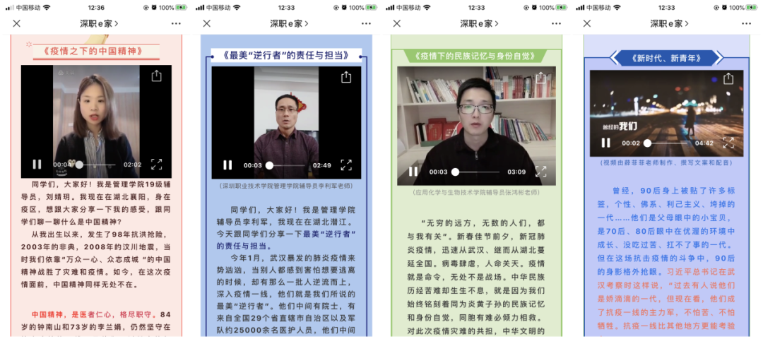 深圳職業(yè)技術(shù)學(xué)院學(xué)生工作部組織33位青年輔導(dǎo)員,推出33講戰(zhàn)“疫情”系列微課程,每天8:30準(zhǔn)時推送。微課程主題涵蓋愛國主義教育、理想信念教育、生命教育、社會責(zé)任感教育、感恩教育,不同的主題、不同的視頻、不同的感悟,輔導(dǎo)員老師和同學(xué)們一起在戰(zhàn)“疫”中成長,為同學(xué)們講述每一個戰(zhàn)“疫”的感人故事。建環(huán)學(xué)院輔導(dǎo)員薛菲菲老師制作精美短視頻、撰寫文案、配樂、配音,以有思想又有溫度的方式與學(xué)生對話。她說,磨煉是成長的催化劑,抗疫是時代給予的成人禮,經(jīng)此一役,中國的年輕人們對責(zé)任和奉獻(xiàn)的感受更加直觀,對勇敢和擔(dān)當(dāng)?shù)睦斫飧由羁蹋袊?,也因?0后,收獲了青春洋溢的蓬勃力量!