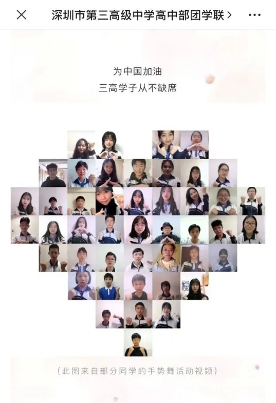 深圳市第三高級中學(xué)團(tuán)委的龐聰老師和同學(xué)們一起錄制了手勢舞《不放棄》,為抗疫一線吶喊加油!活動先由龐聰老師和團(tuán)委學(xué)生聯(lián)合會的同學(xué)們策劃、學(xué)習(xí)、錄制、剪輯、審核,共同制作第一支手勢舞視頻。2月22日,他們在網(wǎng)上發(fā)起手勢舞接力,收到上百名師生發(fā)來的接力視頻,經(jīng)過校團(tuán)委匯總、剪輯、發(fā)布,引起強烈的社會反響。龐老師說:“疫情無情,人間有愛,正是疫情讓我們緊緊地依靠在一起,手勢舞應(yīng)援雖不隆重盛大,但卻也凝結(jié)了我們師生對于疫情重地武漢的鼓勵與支持,對一線醫(yī)療工作者的無私奉獻(xiàn)的感謝?!?/p>