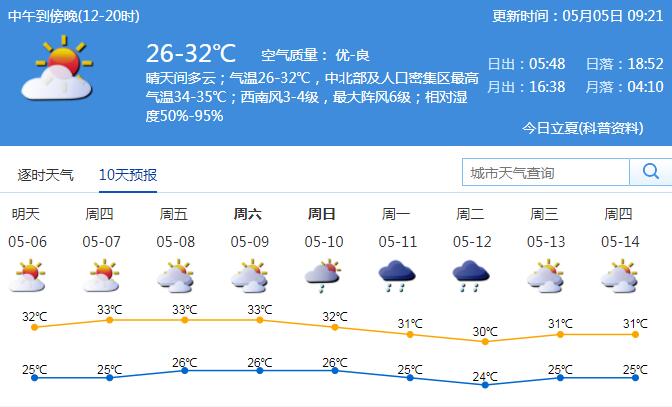 見圳客戶端·深圳新聞網(wǎng)2020年5月5日訊 深圳市氣象臺(tái)預(yù)計(jì),5日我市晴天間多云,氣溫25℃-32℃,中北部和人口密集區(qū)最高氣溫34℃-35℃;6-9日多云間晴天,天氣炎熱,午后局地有熱雷雨;10-11日受冷空氣影響,有雷陣雨。