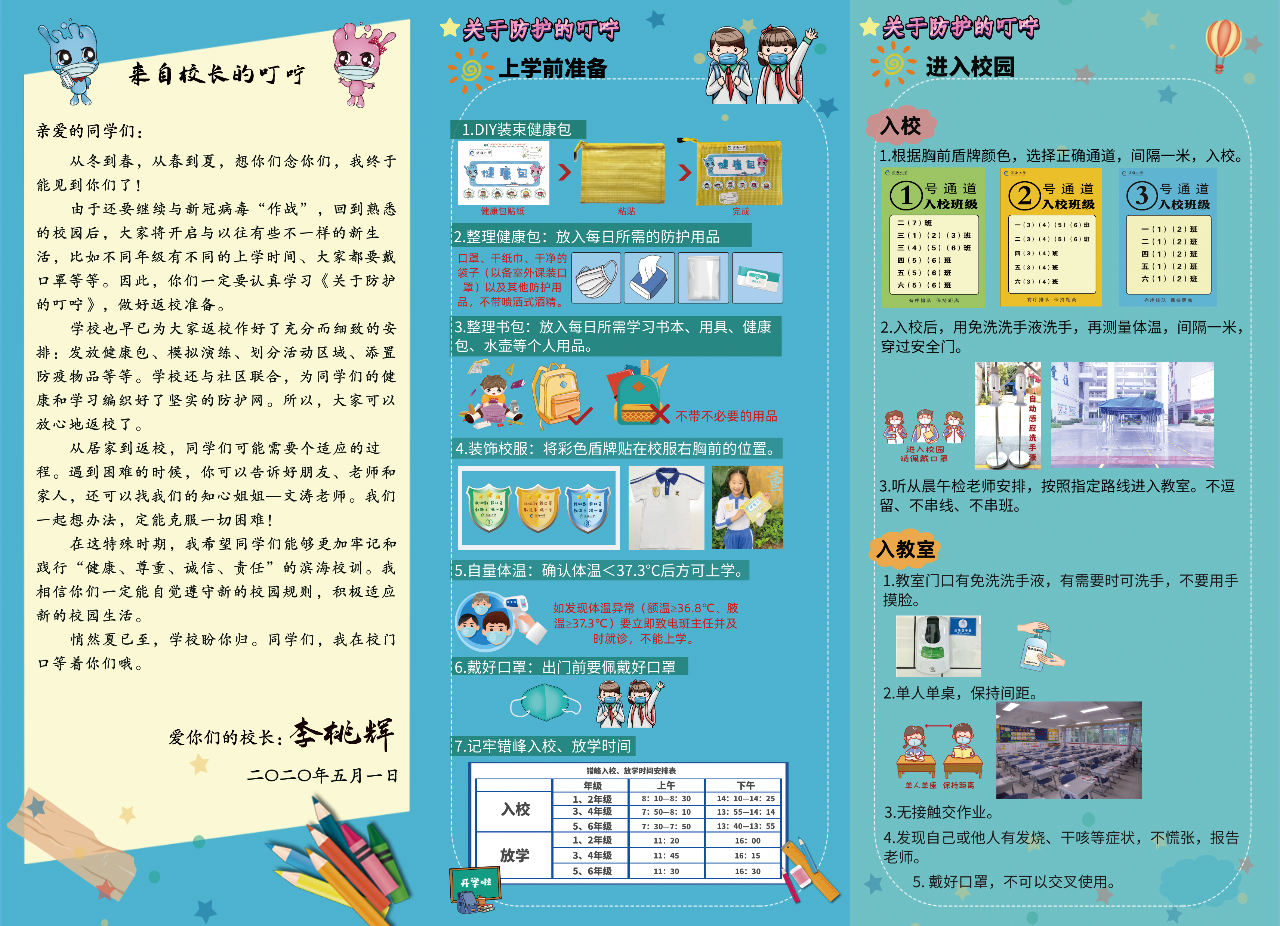 針對(duì)即將返校的學(xué)生,還有一份特別的《叮嚀》,來(lái)自李桃輝校長(zhǎng)《愛的叮嚀》,這里有桃輝校長(zhǎng)的暖心留言,還有幫助孩子們適應(yīng)全然不同的校園新生活的各種說(shuō)明!