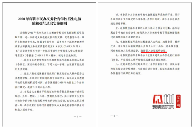 圖為深圳市民辦義務教育學校招生電腦隨機搖號錄取實施細則頁面截圖。