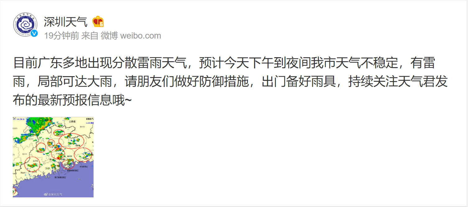 據(jù)@深圳天氣消息,目前廣東多地出現(xiàn)分散雷雨天氣,預(yù)計(jì)今天下午到夜間深圳天氣不穩(wěn)定,有雷雨,局部可達(dá)大雨,請大家做好防御措施,出門備好雨具,持續(xù)關(guān)注深圳天氣發(fā)布的最新預(yù)報(bào)信息。