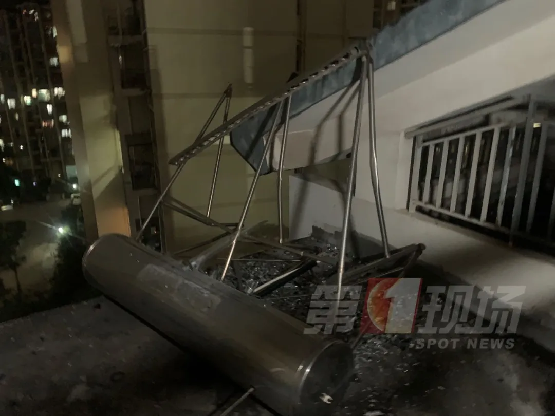 另一個儲水箱,是從該小區(qū)7棟樓頂?shù)?,剛好掉在該?0層住戶家的上方,現(xiàn)場玻璃碎渣散落一地。