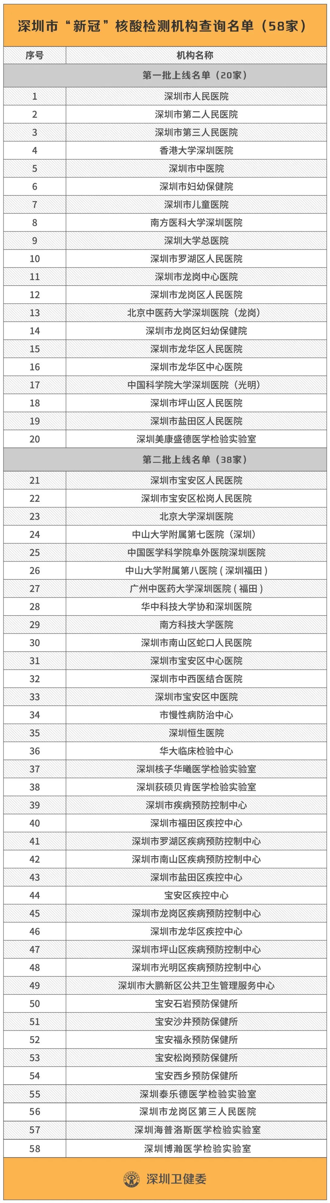 目前,深圳共有58家機(jī)構(gòu)開展新冠病毒核酸檢測,包括35家醫(yī)院、16家公共衛(wèi)生機(jī)構(gòu)和7家第三方檢測機(jī)構(gòu)。