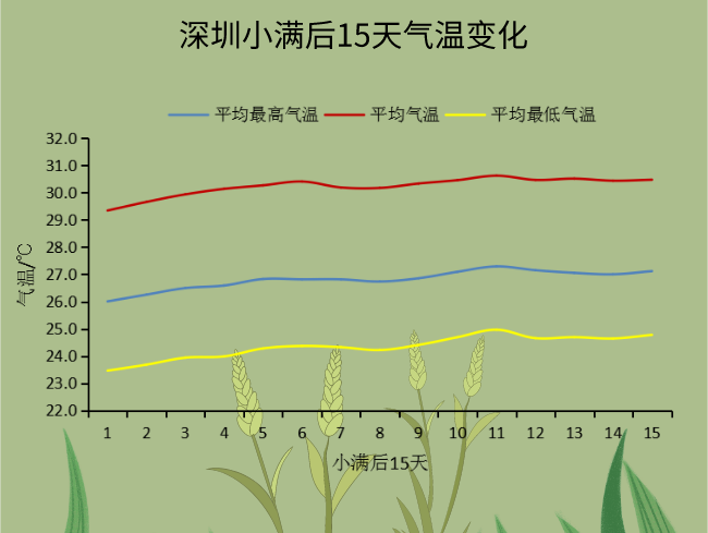 小滿后15天,深圳的平均氣溫為26.8℃,平均最高氣溫為30.2℃,出現33.0℃及以上的炎熱天氣平均有1.5天。盡管小滿時節(jié)的深圳還處在初夏,但給人的感覺已經是盛夏了。歷史上小滿后15天深圳共出現10天的高溫天氣(最高氣溫≥35℃),其中1963年和2000年曾連續(xù)出現2天的高溫天氣。