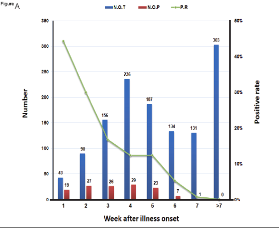 研究發(fā)現(xiàn)此次SARS-CoV-2在感染早期(病程第1周)從腸道排出的陽性率最高(44.19%),而2003年的SARS病毒在腸道的檢出率通常需要在2~3周時才能達到高峰。隨著病程進展,SARS-CoV-2在糞便中病毒核酸的陽性率逐步下降,在病程的4~5周形成一個平臺期。通過對患者的臨床資料分析,在病程的3~5周時,大部分患者臨床癥狀已消失,各項指標(biāo)達到了出院標(biāo)準(zhǔn),但仍有12%的患者糞便可以持續(xù)排毒,提示對于康復(fù)期患者仍需加強糞便管理,防止糞口傳播。研究發(fā)現(xiàn)在病程第7周時仍然有2例患者糞便核酸陽性,但病程7周以上的患者(共篩檢303例)的糞便病毒核酸未再檢出陽性。