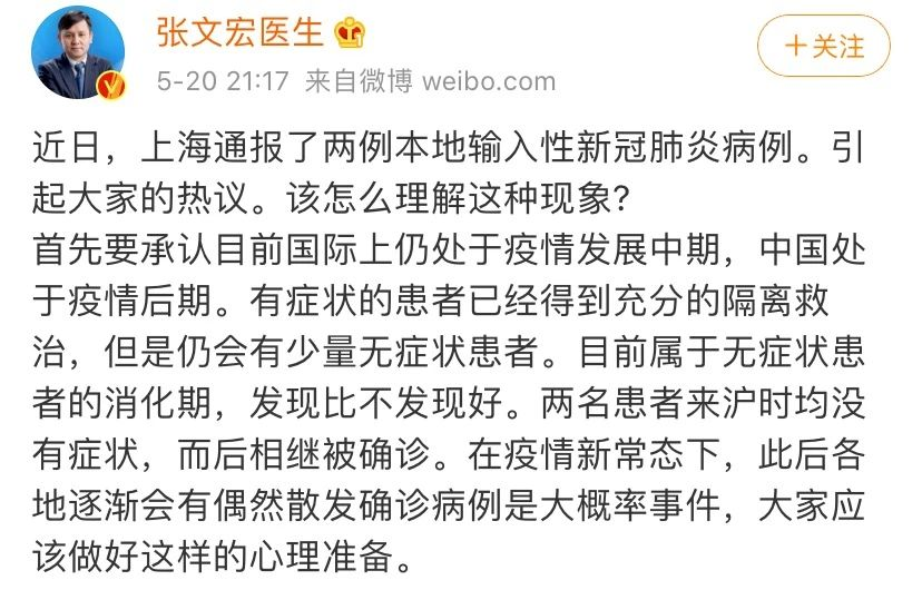 近日,上海通報了兩例本地輸入性新冠肺炎病例。20日晚間,上海新冠肺炎醫(yī)療救治組組長、復(fù)旦大學(xué)附屬華山醫(yī)院感染科主任張文宏發(fā)布微博稱,兩名患者來滬時均沒有癥狀,而后相繼被確診。