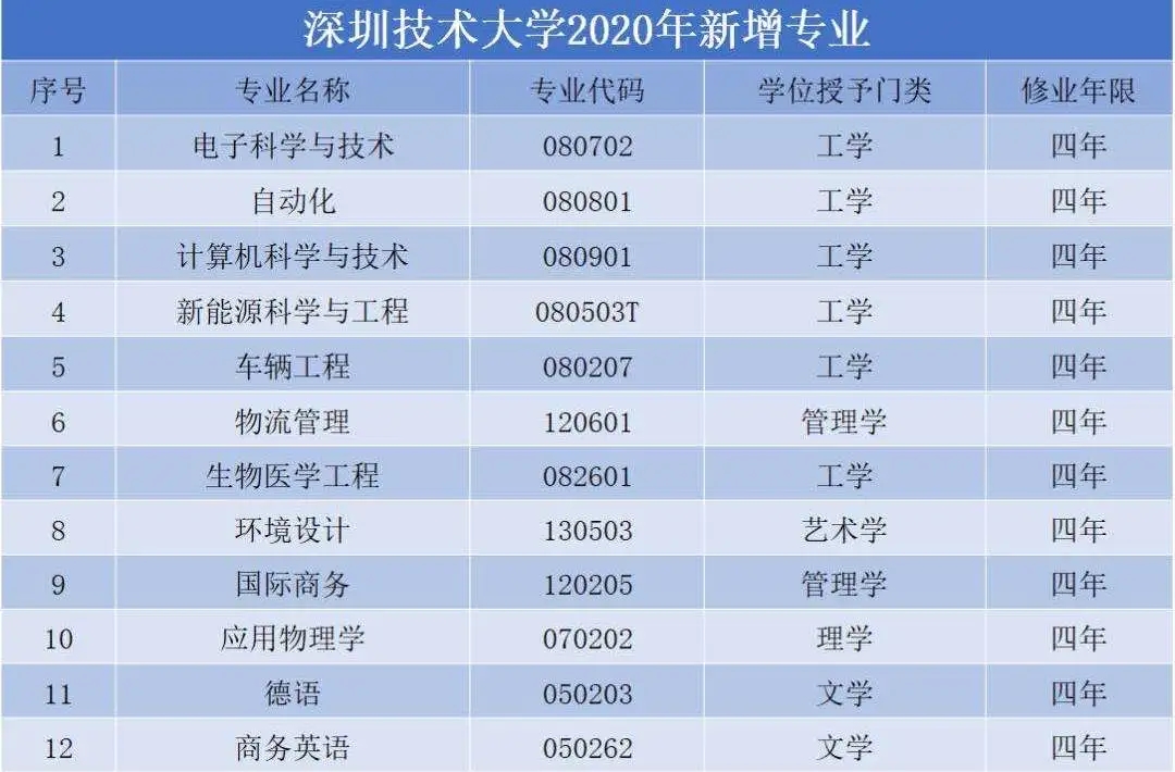 據(jù)教育部2019年本科專(zhuān)業(yè)備案和審批結(jié)果,在2019年機(jī)械設(shè)計(jì)制造及其自動(dòng)化、物聯(lián)網(wǎng)工程、光源與照明、交通運(yùn)輸、汽車(chē)服務(wù)工程、工業(yè)設(shè)計(jì)等6個(gè)專(zhuān)業(yè)的基礎(chǔ)上,2020年,深圳技術(shù)大學(xué)將新增12個(gè)專(zhuān)業(yè),屆時(shí)招生專(zhuān)業(yè)將達(dá)18個(gè)。