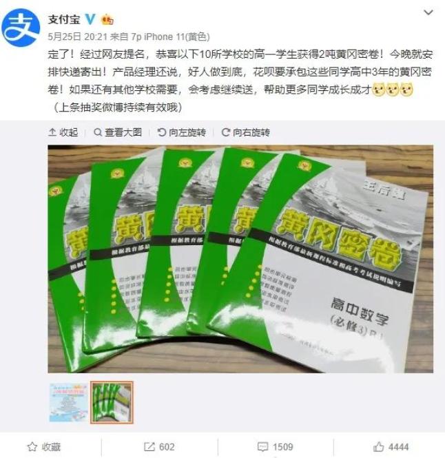 前段時(shí)間,支付寶發(fā)布了學(xué)雜費(fèi)支持分期的微博,評論里有家長在呼喚學(xué)習(xí)資料,所以花唄產(chǎn)品經(jīng)理決定除了學(xué)雜費(fèi)分期,再買2噸黃岡密卷送人。