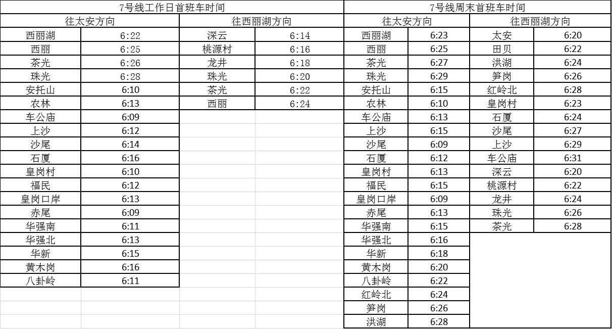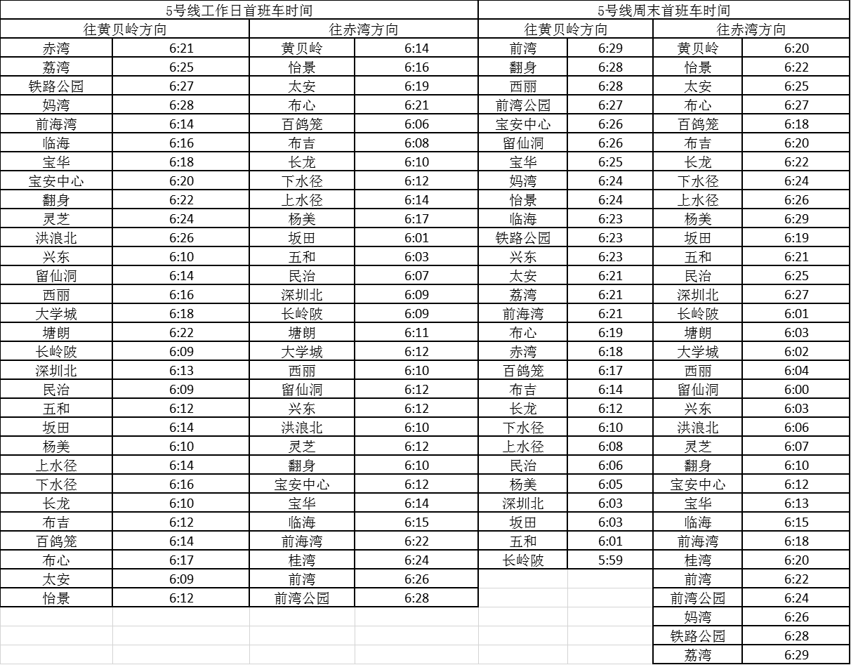 記者獲悉,經(jīng)優(yōu)化調(diào)整后,各線路工作日首班車最早發(fā)車站點(diǎn)及時(shí)間分別為,1號(hào)線老街站6:29、2號(hào)線蛇口港站6:14、3號(hào)線塘坑站6:05、5號(hào)線坂田站6:01、7號(hào)線赤尾6:09、9號(hào)線銀湖6:05、11號(hào)線機(jī)場(chǎng)站6:04。周末期間首班車最早發(fā)車站點(diǎn)及時(shí)間分別為,2號(hào)線香梅北站6:07、3號(hào)線塘坑站6:04、5號(hào)線長(zhǎng)嶺陂站6:00、7號(hào)線皇崗口岸站6:09、9號(hào)線孖嶺站6:05、11號(hào)線機(jī)場(chǎng)站6:03。