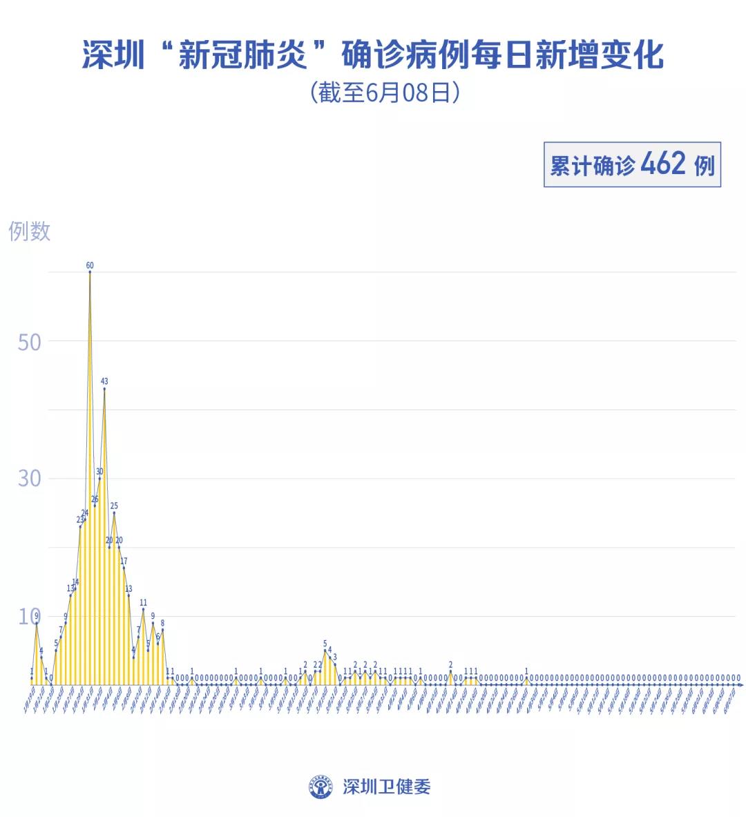 截至6月8日24時,深圳累計報告新冠肺炎病例462例。