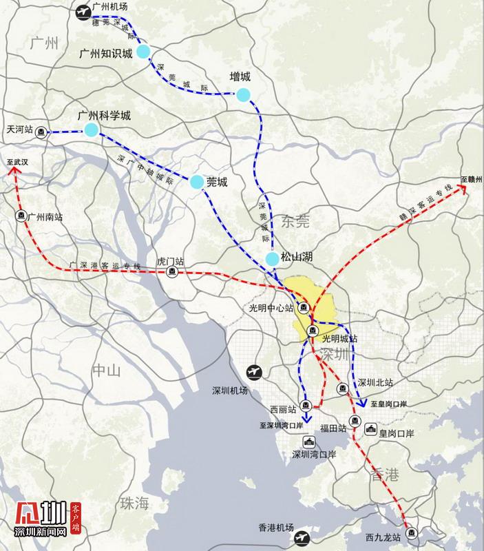 完善產(chǎn)學(xué)研結(jié)合的共享服務(wù)。光明科學(xué)城將建設(shè)產(chǎn)業(yè)服務(wù)中心和產(chǎn)業(yè)創(chuàng)新轉(zhuǎn)化服務(wù)平臺(tái),鼓勵(lì)企業(yè)開(kāi)放圍墻,增加沿街界面,鼓勵(lì)土地混合利用,提升產(chǎn)城融合水平,增加城市活力,促進(jìn)產(chǎn)業(yè)創(chuàng)新。在交通網(wǎng)絡(luò)方面,光明科學(xué)城依托中深惠城際、深莞城際和城市軌道,加強(qiáng)與深圳寶安國(guó)際機(jī)場(chǎng)、廣州白云國(guó)際機(jī)場(chǎng)的快速聯(lián)系;依托廣深港客專(zhuān)、深莞城際、深廣中軸城際和城市軌道,加強(qiáng)與香港西九龍口岸、深圳灣口岸、皇崗口岸、福田口岸等的便捷聯(lián)系;加快深廣中軸城際、深莞城際軌道規(guī)劃建設(shè),推動(dòng)深莞城際與深廣中軸城際、中深惠城際、中虎龍城際和莞惠城際的“互聯(lián)互通”。